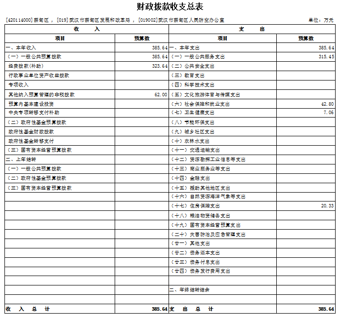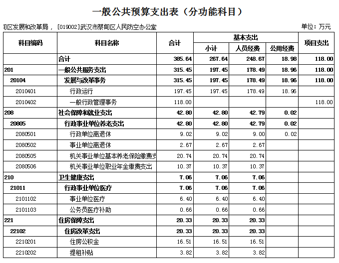 2024年一般公共预算支出385.64万元,主要包括一般公共服务支出315.45万元;社会保障和就业支出42.8万元;卫生健康支出7.06万元;住房保障支出20.33万元。
