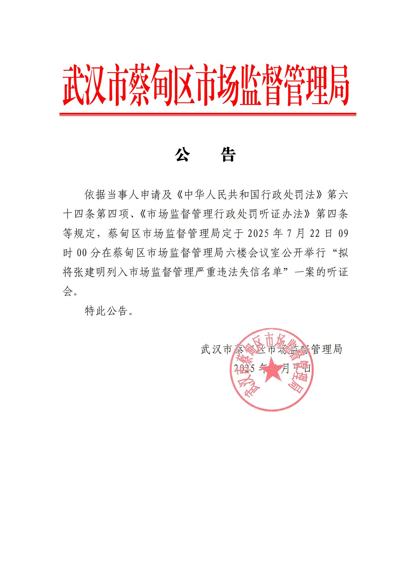 蔡甸区市场监督管理局听证公告