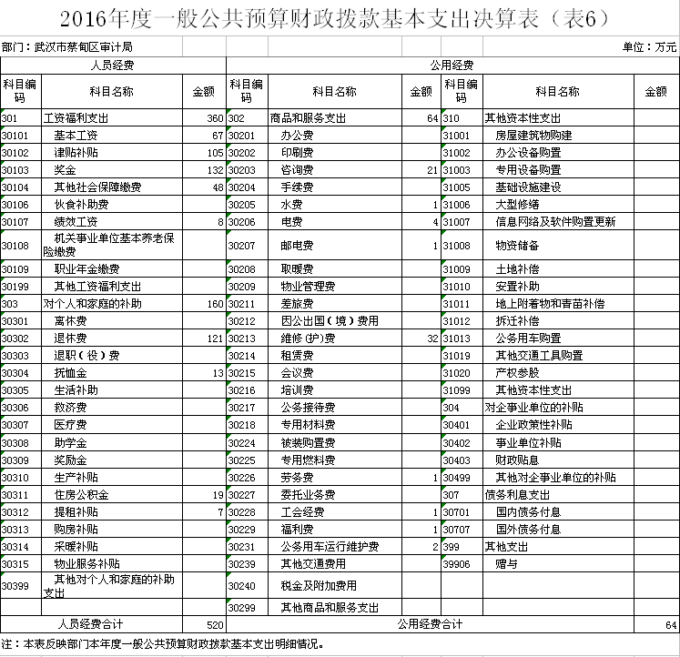 2016度一般公共预算财政拨款基本支出584万元,其中,人员经费520万元,主要包括:基本工资、津贴补贴、奖金、其他社会保障缴费、绩效工资、机关事业单位基本养老保险缴费、职业年金缴费、其他工资福利支出、离休费、退休费、退职(役)费、抚恤金、生活补助、救济费、医疗费、助学金、奖励金、住房公积金、提租补贴、购房补贴、物业服务补贴、其他对个人和家庭的补助支出;公用经费64万元,主要包括:办公费、印刷费、咨询费、手续费、水费、电费、邮电费、取暖费、物业管理费、差旅费、因公出国(境)费、维修(护)费、租赁费、会议费、培训费、公务接待费、专用材料费、专用燃料费、劳务费、委托业务费、工会经费、福利费、公务用车运行维护费、其他交通费用、税金及附加费用、其他商品和服务支出、办公设备购置、专用设备购置、信息网络及软件购置更新、公务用车购置、其他交通工具购置、其他资本性支出、企业政策性补贴、事业单位补贴、其他对企事业单位的补贴。