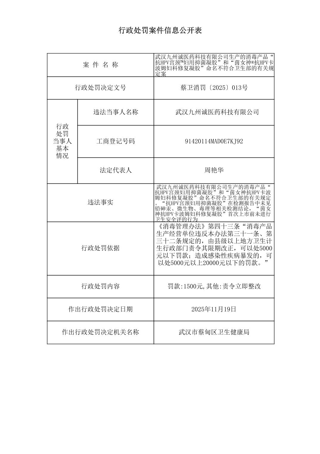 武汉九州诚医药科技有限公司生产的消毒产品“抗HPV宫颈™妇用抑菌凝胶”和“茵女神®抗HPV卡波姆妇科修复凝胶”命名不符合卫生部的有关规定案