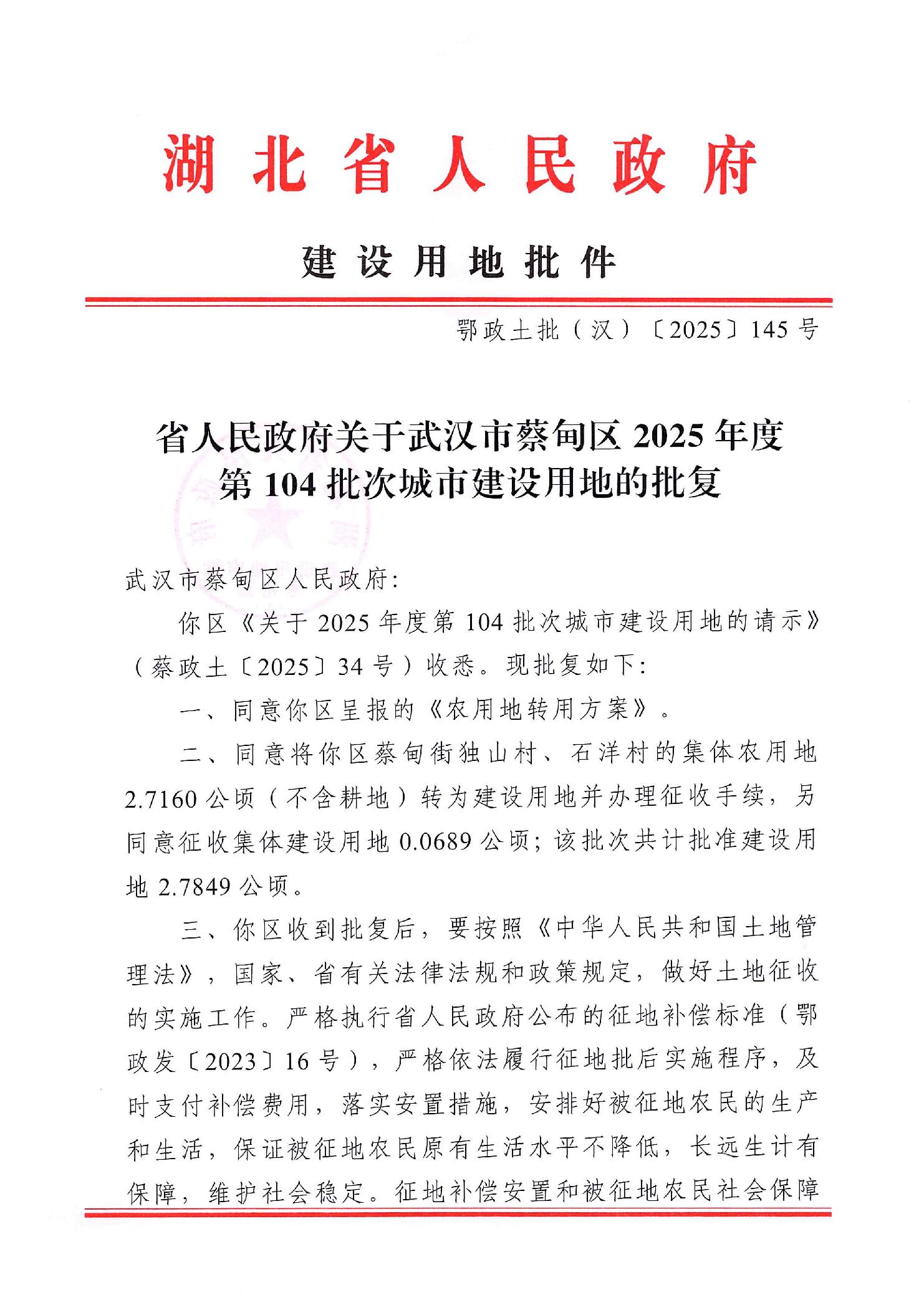 武汉市蔡甸区2025年度第104批次城市建设用地的批复