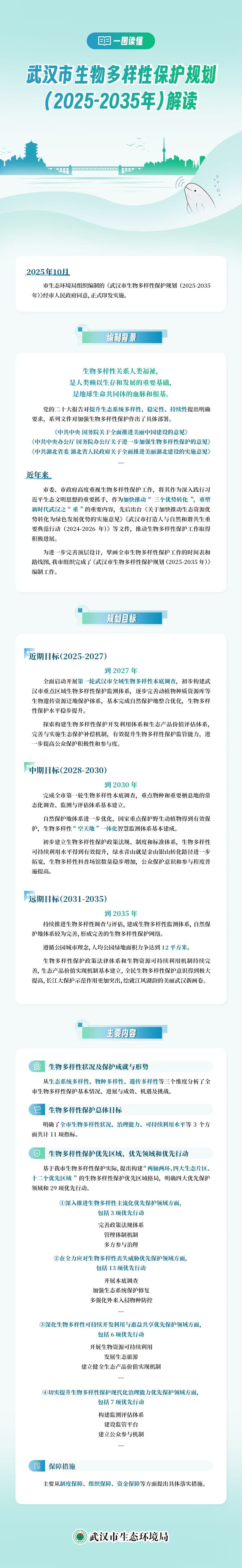 2025年10月,市生态环境局组织编制的《武汉市生物多样性保护规划(2025-2035年)》经市人民政府同意,正式印发实施。