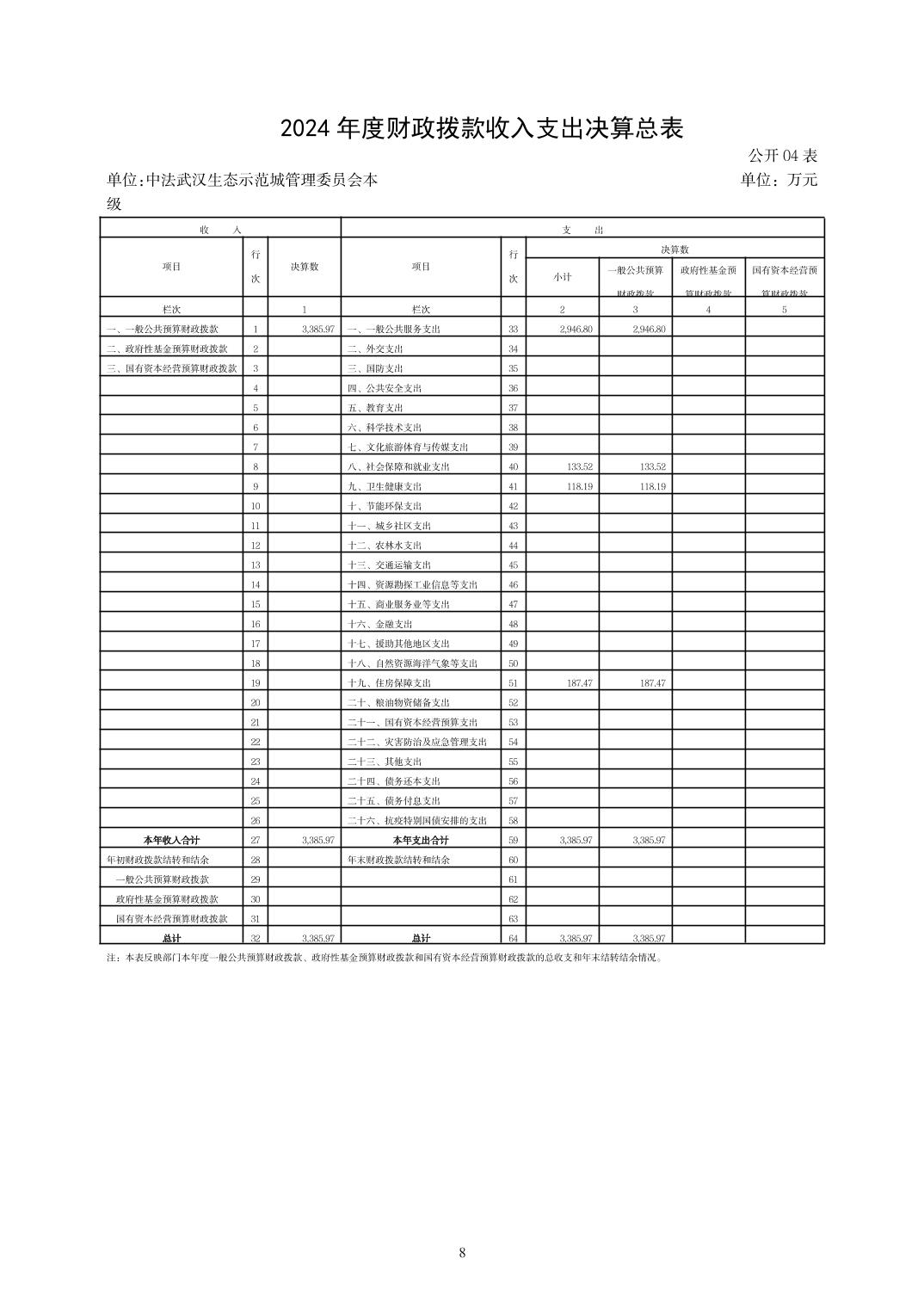 | 发布机构 | 中法武汉生态示范城管理委员会 | 文 号 | 2024年度中法武汉生态示范城管理委员会本级部门决算公开 |
