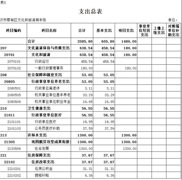 2026年财政拨款(补助)预算总支出2085.8万元,主要包括文化旅游体育与传媒支出基本支出类(含人员工资及公用经费)588.54万元,社会保障和就业支出53.05万元,卫生健康支出56.55元,农林水(乡村振兴)支出1300万元,住房保障支出37.67万元。