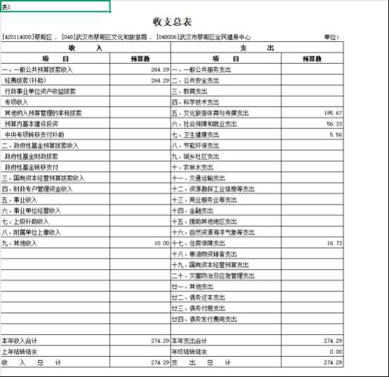 2026年部门预算总支出274.29万元,主要包括文化体育与传媒支出195.67万元,社会保障和就业支出56.33万元,医疗卫生支出5.56万元,住房保障支出16.73万元。
