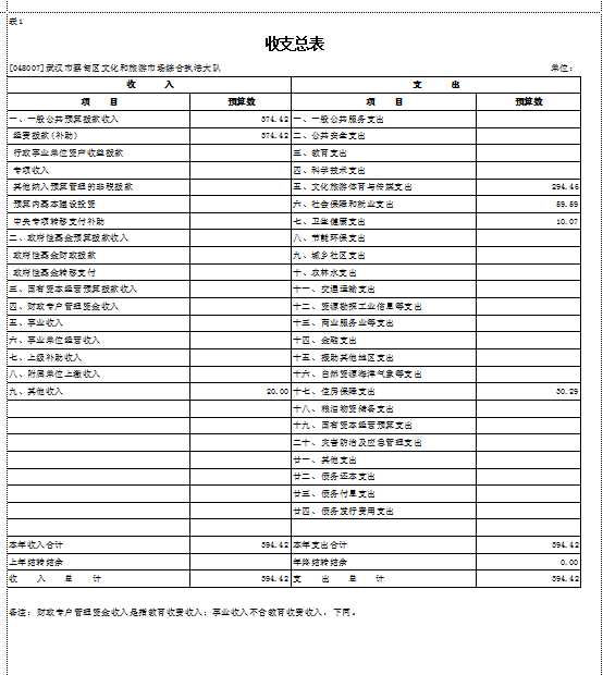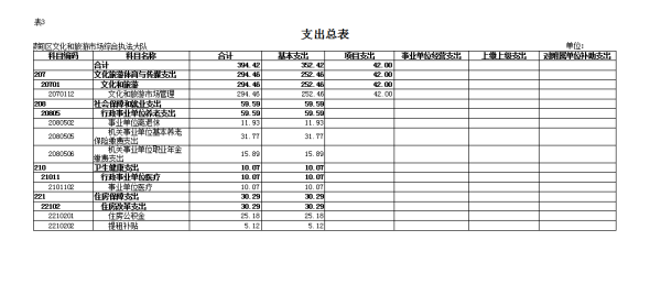 2026年部门预算总支出394.42万元,其中:一般公共预算总支出374.42万元,主要包括文化旅游体育与传媒支出274.46万元,社会保障和就业支出59.59万元,健康卫生支出10.07元,住房保障支出30.29万元,文化稽查执法经费支出22万元。其他收入弥补文化稽查经费支出20万。