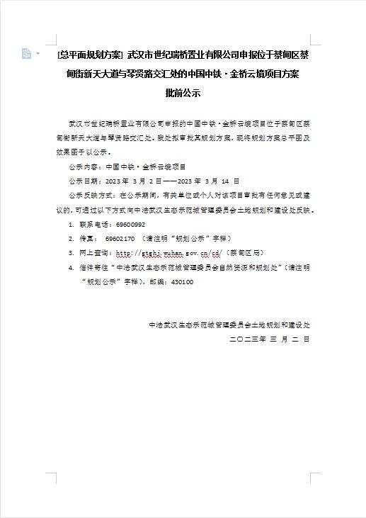 [总平面规划方案] 武汉市世纪瑞桥置业有限公司申报位于蔡甸区蔡甸街新天大道与琴贤路交汇处的中国中铁·金桥云境项目方案 批前公示