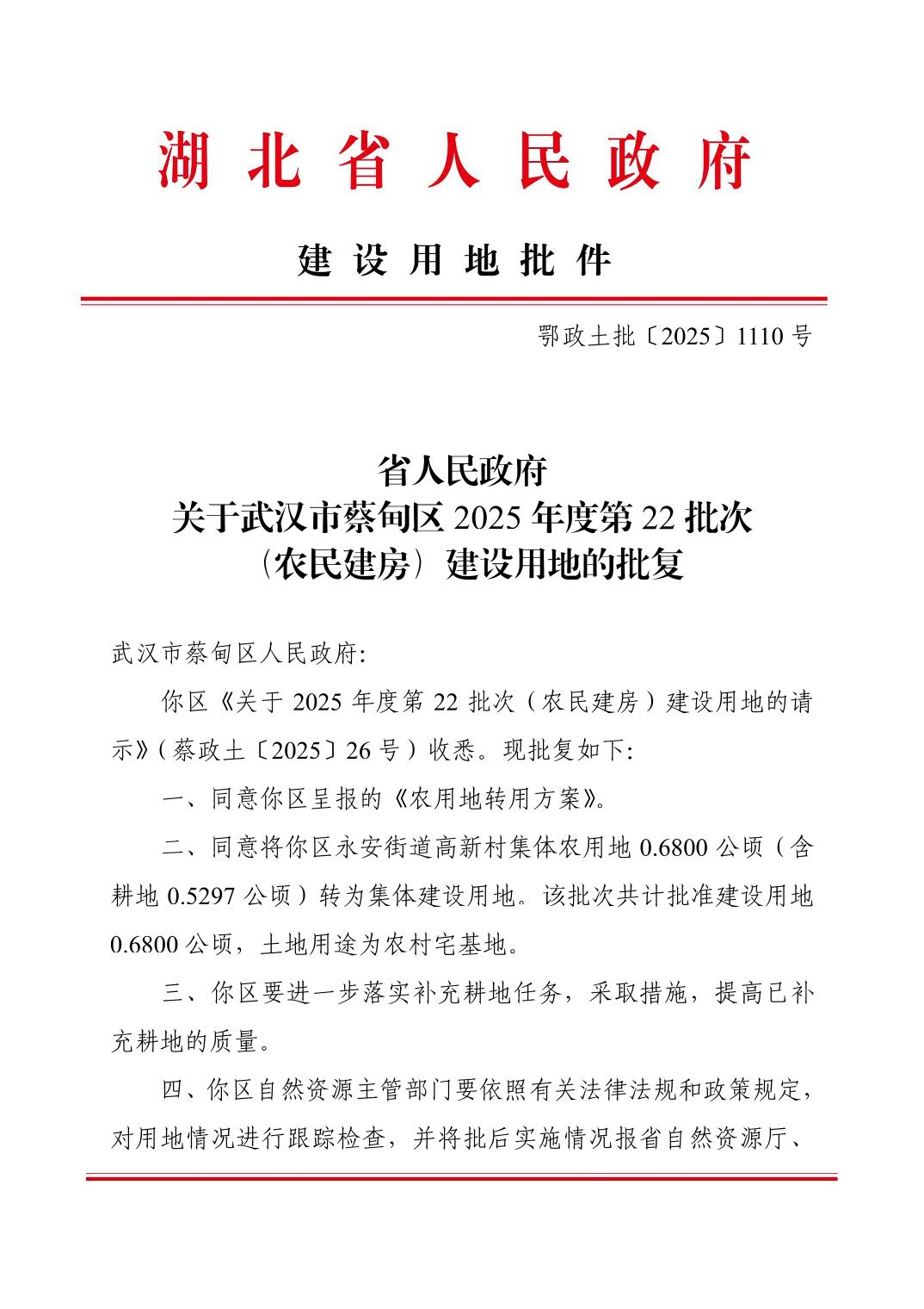 武汉市蔡甸区2025年度第22批次(农民建房)建设用地的批复