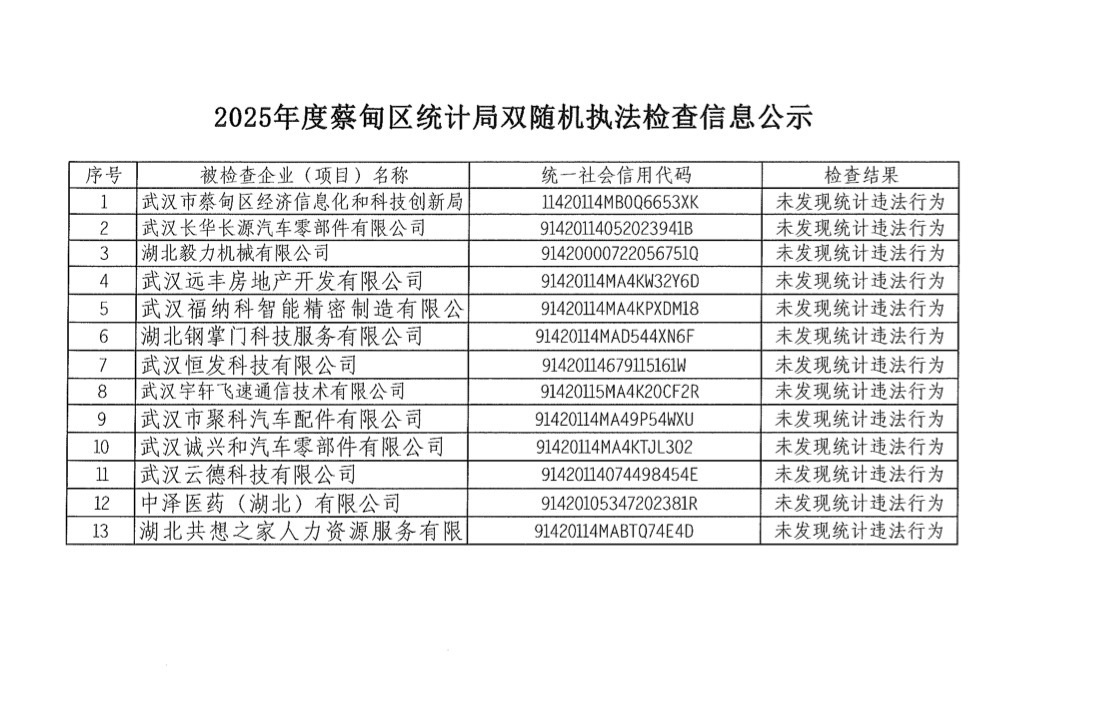 2025年度蔡甸区统计局双随机执法检查信息公示