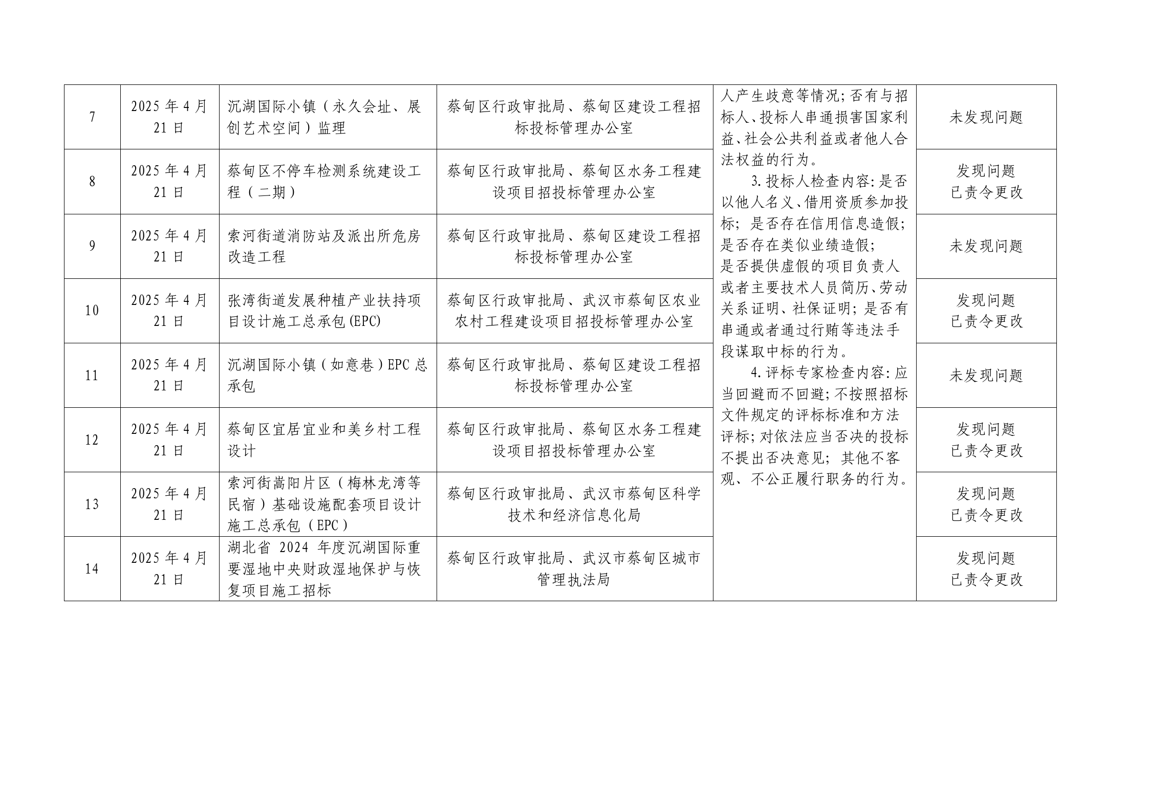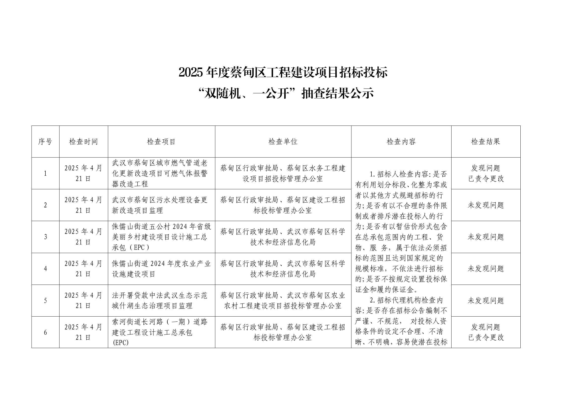 2025年度蔡甸区工程建设项目招标投标“双随机、一公开”抽查结果公示