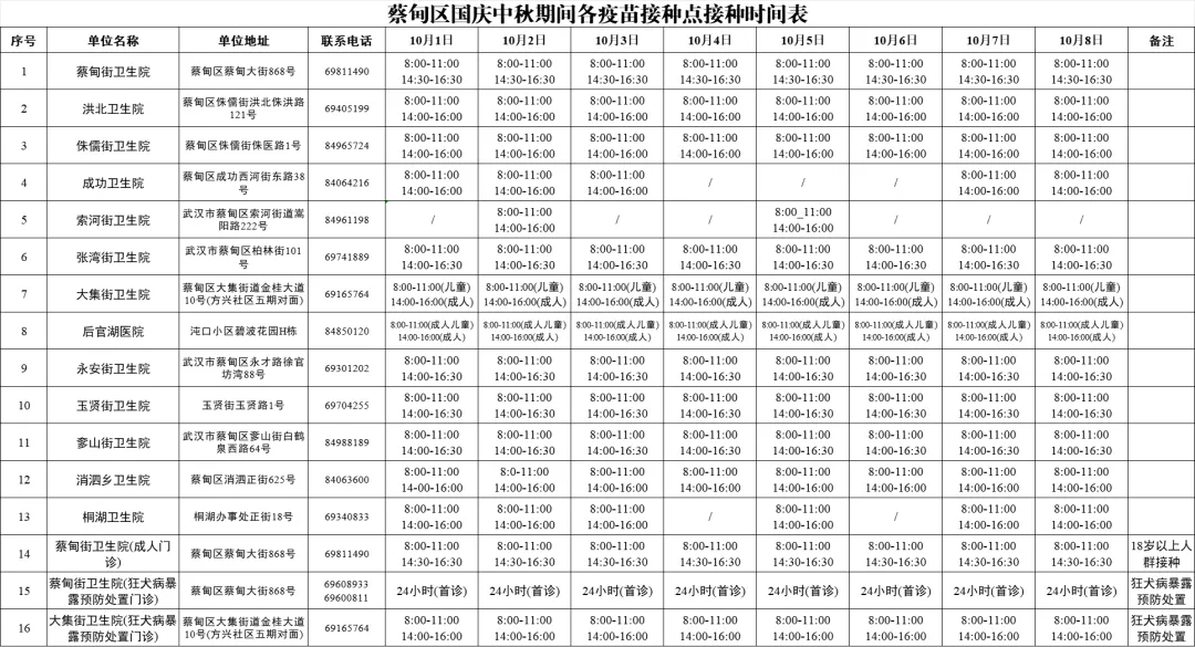 蔡甸区2025年国庆假期预防接种服务时间公示